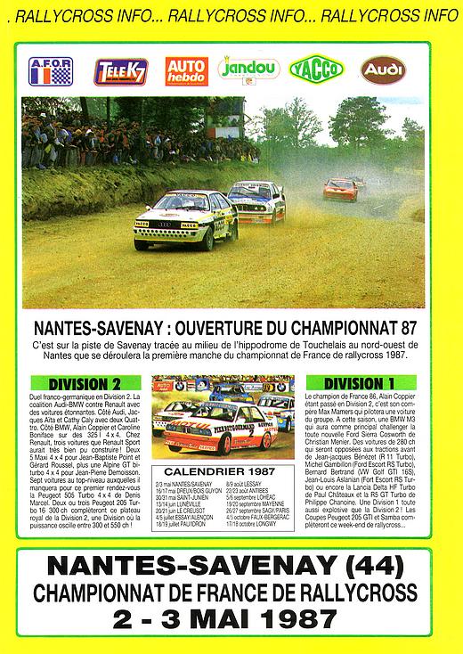 Ouverture du championnat 87 C'est sur la piste de Savenay tracée au milieu de l'hippodrome de Touchelais au nord-ouest de Nantes que se déroulera la première manche du championnat de France de rallycross 1987. DIVISION 2 Duel franco-germanique en Division 2. La coalition Audi-BMW contre Renault avec des voitures étonnantes. Côté Audi, Jacques Aïta et Cathy Caly avec deux Quattro. Côté BMW, Alain Coppier et Caroline Boniface sur des 325i 4x4. Chez Renault, trois voitures que Renault Sport aurait très bien pu construire ! Deux 5 Maxi 4x4 pour Jean-Baptiste Point et Gérard Roussel, plus une Alpine GT bi-turbo 4x4 pour Jean-Pierre Demoisson. Sept voitures au top-niveau auxquelles il manquera pour ce premier rendez-vous la Peugeot 505 Turbo 4x4 de Denis Marcel. Deux ou trois Peugeot 205 Turbo 16 300 ch compléteront ce plateau royal de la Division 2, une Division où la puissance oscille entre 300 et 550 ch ! DIVISION 1 Le champion de France 86, Alain Coppier étant passé en Division 2, c'est son compère Max Mamers qui pilotera une voiture du groupe A cette saison, une BMW M3 qui aura comme principal challenger la toute nouvelle Ford Sierra Cosworth de Christian Ménier. Des voitures de 280 ch qui seront opposées aux tractions avant de Jean-Jacques Bénézet (R11 Turbo), Michel Gambillon (Ford Escort RS Turbo), Bernard Bertrand (VW Golf GTI 16S), Jean-Louis Aslanian (Fort Escort RS Turbo) ou encore la Lancia Delta HF Turbo de Paul Châteaux et la R5 GT Turbo de Philippe Chanoine. Une Division 1 toute aussi explosive que la Division 2 ! Les Coupes Peugeot 205 GTI et Samba compléteront ce week-end de rallycross... |