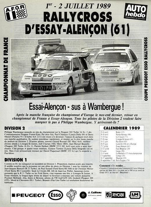 Sus à Wambergue ! Après la manche française du championnat d'Europe le week-end dernier, retour en championnat de France à Essay-Alençon. Tous les pilotes de la Division 2 veulent faire marquer le pas à Philippe Wambergue. Y arriveront-ils ? Division 2 Philippe Wambergue caracole en tête du championnat sur la Peugeot 205 Turbo 16 Ev. 2 des Concessionnaires Peugeot France-Esso. Par deux fois, Paul Châteaux (Lancia Delta S4) et Denis Marcel (Porsche 911 bi-turbo 4x4 2.8L) ont réussi a le devancer, l'espace de quelques tours dans une manche qualificative. Ils veulent concrétiser rapidement, et monter sur la plus haute marche du podium en Division 2. D'autres pilotes, comme Gérard Roussel (R5 Maxi 4x4), meilleur chrono absolu à Limoges-St Junien, Joël Champs (MG Metro 6R4), Jean-Manuel Beuzelin (Peugeot 205 Turbo 16 Ev. I ), Patrick Herbert (BMW 325i M1 4x4) sont prêts à saisir leur chance. Côté groupe A quatre roues motrices, Gustave Tarrière (Lancia Delta Integrale) est en tête. Mais il est sérieusement menacé par Daniel Paqueraud (BMW 325 ix) qui l'a emporté a Pau-Idron. Division 1 Comme en 88, les vainqueurs se succèdent en Division 1. Propulsion, traction avant, peu importe. Il semble toutefois que la puissance est une alliée de choix en Division 1 avec les victoires de Jean-Jacques Bénézet (R21 Turbo), de Paul Surand (Ford Sierra RS500) et de Christian Ménier (Ford Sierra RS Cosworth). Seule la Citroën BX 16S de Jean-Luc Pailler, beaucoup moins puissante que la R21 Turbo ou les Ford Sierra, s'est imposée une fois, à Limoges-St Junien. A Essay-Alençon, la longue ligne droite de départ va favoriser à nouveau une voiture puissante. Pourtant Bertrand, Aïta, Jestin et Bévione, pilotes de VW Golf GTI 16S, Godard (Peugeot 309 GTI), Morel et Chevreton (R11 Turbo), Brunetti (Fiai Uno Turbo ie) souhaitent bouleverser les habitudes. |