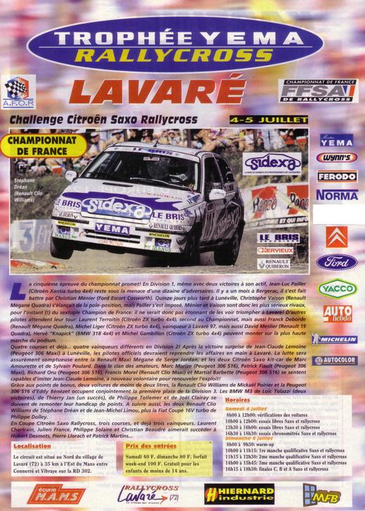 podium. Quatre courses et déjà... quatre vainqueurs différents en Division 2 ! Après la victoire surprise de Jean-Claude Lemoine (Peugeot 306 Maxi) à Lunéville, les pilotes officiels devraient reprendre les affaires en main à Lavaré. La lutte sera assurément somptueuse entre la Renault Maxi Mégane de Serge Jordan, et les deux Citroën Saxo kit-car de Marc Amourette et de Sylvain Poulard. Dans le clan des amateurs, Marc Morize (Peugeot 306 S16), Patrick Fiault (Peugeot 306 Maxi), Richard Oru (Peugeot 306 S16), Francis Morel (Renault Clio Maxi) et Martial Barbette (Peugeot 306 S16) se sentent capables d'imiter Jean-Claude Lemoine, à nouveau volontaire pour renouveler l'exploit ! Grâce aux points de bonus, deux voitures de moins de deux litres, la Renault Clio Williams de Mickaël Poirier et la Peugeot 306 S16 d'Eddy Bénezet occupent conjointement la première place de la Division 3. Les BMW M3 de Loïc Tolazzi (deux victoires), de Thierry Jan (un succès), de Philippe Tollemer et de Joël Clairay se doivent de remonter leur handicap de points. A suivre aussi, les deux Renault Clio Williams de Stéphane Dréan et de Jean-Michel Limou, plus la Fiat Coupé 16V turbo de Philippe Dolley. En Coupe Citroën Saxo Rallycross, trois courses, et déjà trois vainqueurs. Laurent Chartrain, Julien France, Philippe Solaire et Christian Beaudré aimerait succéder à Hubert Desmots, Pierre Llorach et Patrick Martins... |